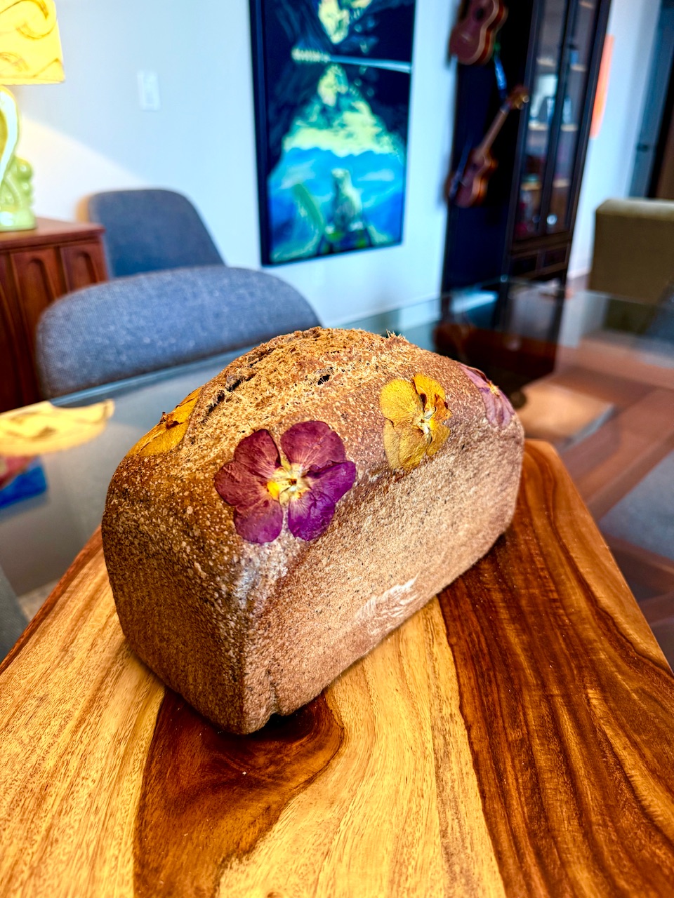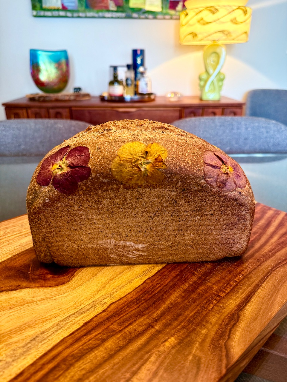 Almost had a top on but circumstances dictated a topless loaf . All whole grains Yecoro Rojo, Spelt , and Rye with purchased Golden Temple Fine Durum Atta. 600g of flour combo , 150g of Trinity ( used date nectar as sweetener and buttermilk and EVOO) 360 g very very active levain . Misjudged the amount of H2O the flour was quite dry and needed to add +200g so 1600 g loaf in a 1400g pan! Ooops. Topless is the way to go.