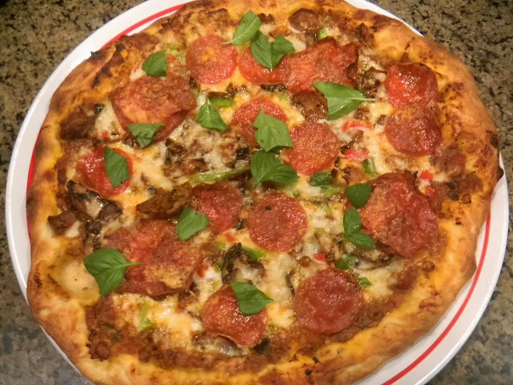 The crust was browned evenly on the rim and underneath, it was very crisp, the way we like it and not foldable soggy like NY pizza. It tasted great with a fresh basil garnish. My daughter said it was her favorite crust to date which is saying something.....but for me, I thought it was pretty good but nit as tasty as some sourdough ones of the past.