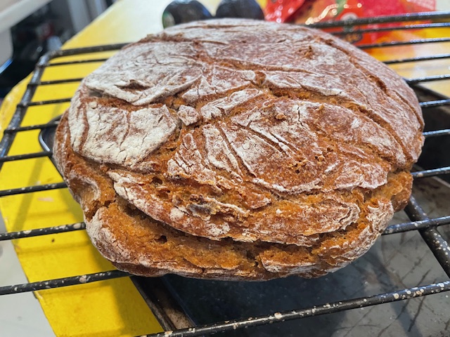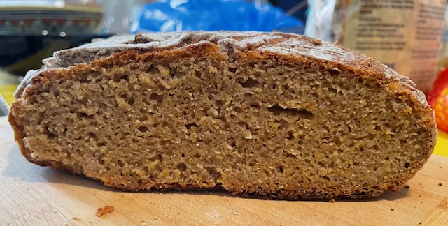 We returned home a couple of weeks ago from a trip to Myrtle Beach and needed some bread. After a bit of consideration, I opened The Rye Baker and began thumbing through it. Several breads looked appealing and I eventually selected the Milk Rye. It’s one that I haven’t made previously. The bread is about 60:40 rye:wheat (medium rye flour and bread flour). My deviations were to substitute whole rye flour that I milled in place of the medium rye flour, 2% milk for the whole milk, and ADY for the IDY.