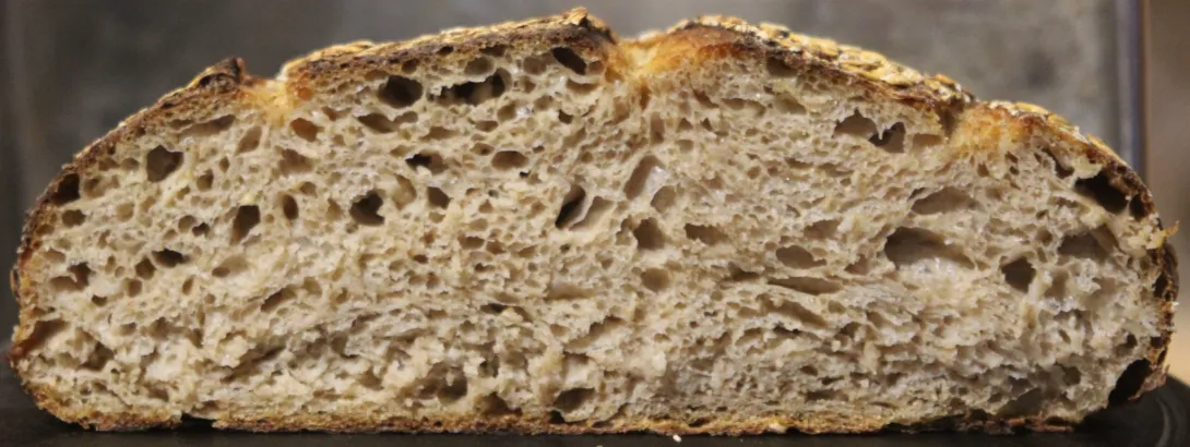 The yeast seemed to make the crumb slightly stiff, which was unfortunate. However, the flavor was pleasantly mild, allowing the oats to come through clearly. An image of the crumb is below.