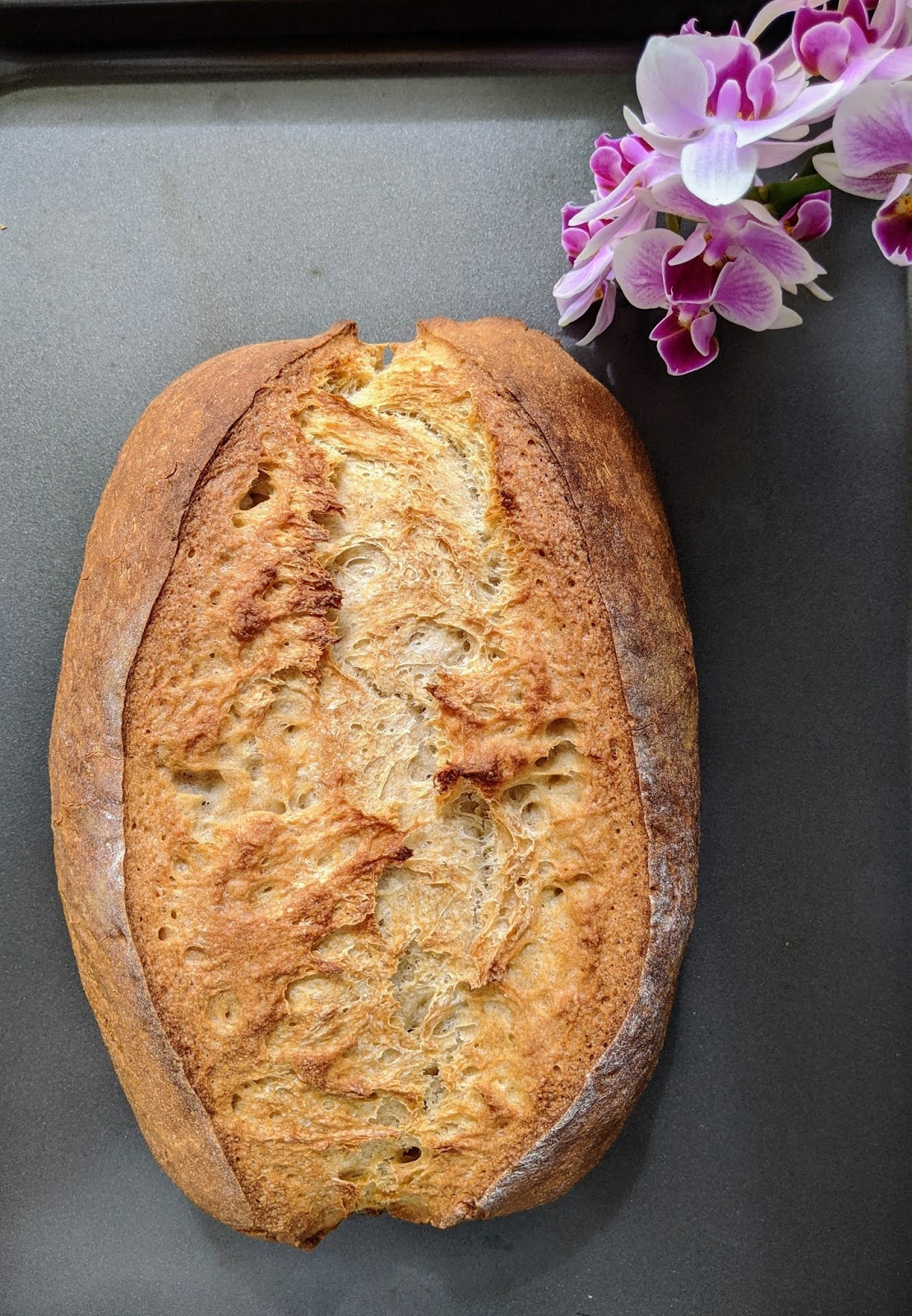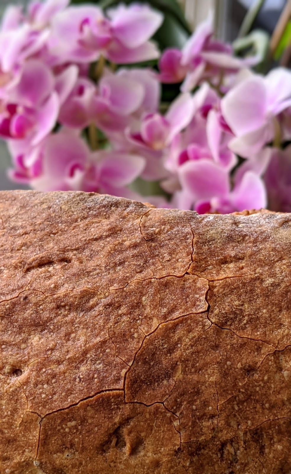 Clas bread has a wonderful sweetness though I did not add any sweetener. The aroma in the kitchen is distinctive and delightful. The bread is easy to cut and won’t dull my bread knife the way a crackling crust does. There is no pastiness but bread is denser (not dreadful) than an airy bubbly sourdough. Procedure requires less tending than usual sourdough method with starter- 1 day to mix and bake. Work saved: No sieving the ww flour and regrinding the coarser parts; no messy table laminating or performing long coil folds; no overnight retard;