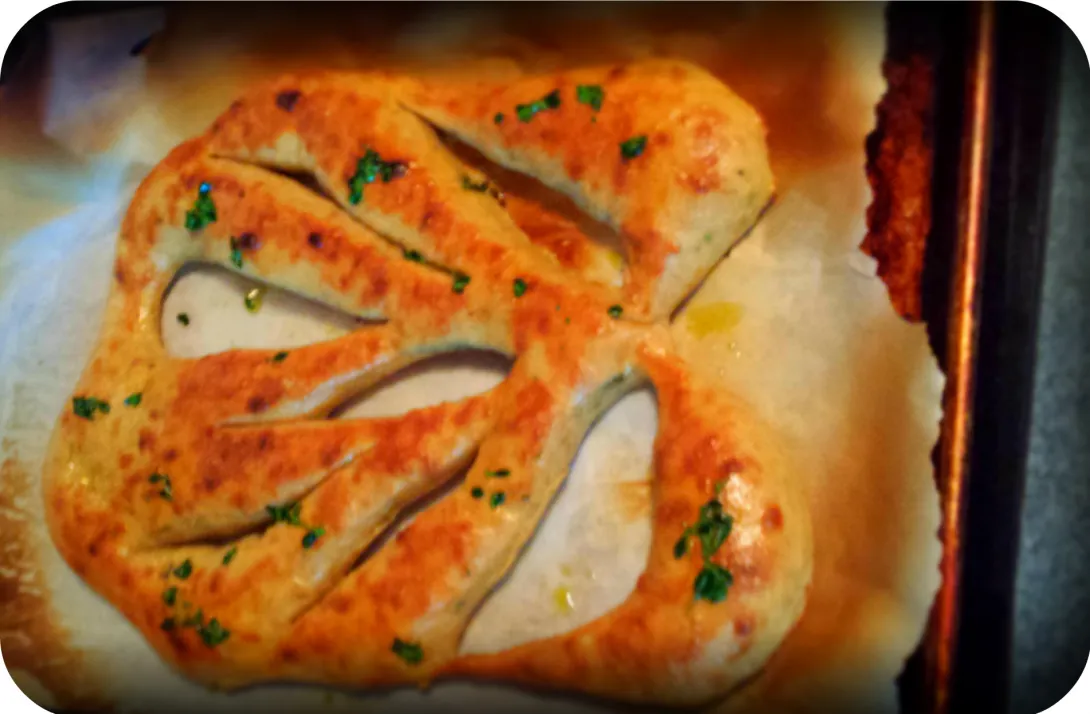 I've made fougasse before but this time tried the shaping technique demonstrated by Ciril Hitz in this video: www.youtube.com/watch?v=JSv4nGAuhig