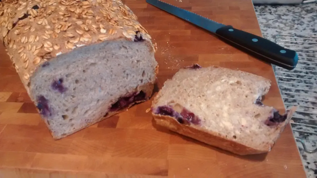 A whole wheat sandwich loaf with blueberries and rolled oats. It made delicious toast :)