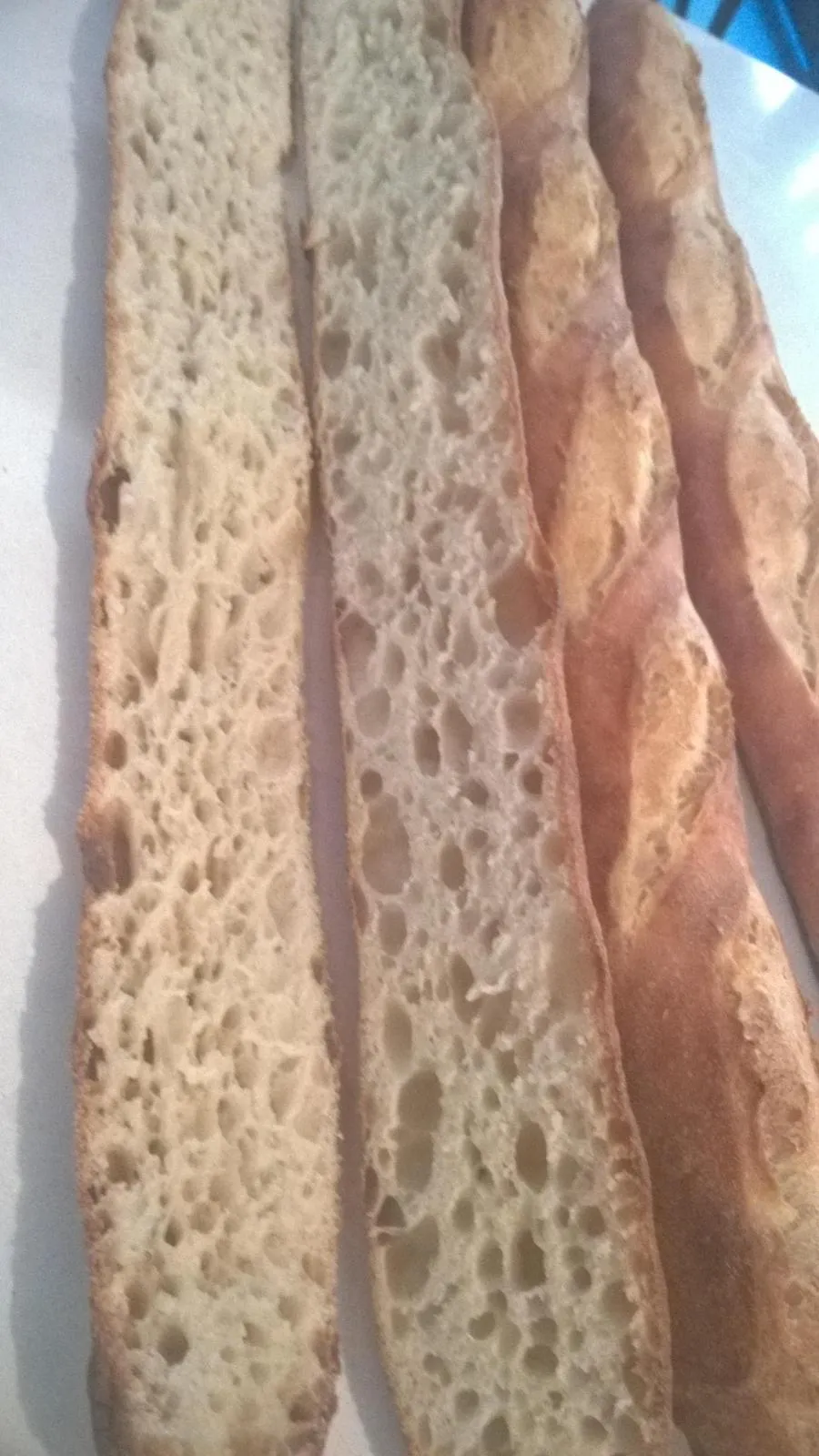 My poor little oven is dying a slow death. It no longer gets above 500f - this bake took 25 minutes - a good bake for long baguettes should be 20 max preferably 18. Result, disappointing pop, but fortunately decent structure on the inside. Dark on the bottom and thicker tougher crust. This mix was rather low and slow on yeast getting about 1.5 volume overnight on cold retard had these puppies been given a bit more kick i am sure they'd be fantastic ... Quelle dommage !