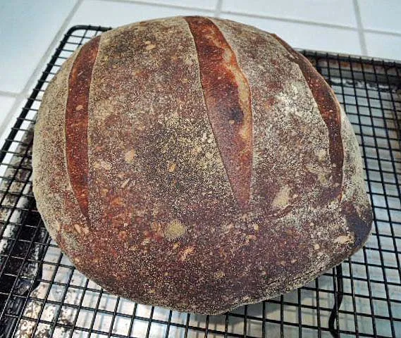 Today's bake was Hamelman's Pain au Levain with Whole Wheat Flour. This is one of a series of versions of Pain au Levain in Bread. I have baked all of them - several, like this one, many times. My favorite is whichever one just cooled enough to eat. This one was pretty yummy. Crunchy crust, chewy crumb. Complex wheaty flavor.