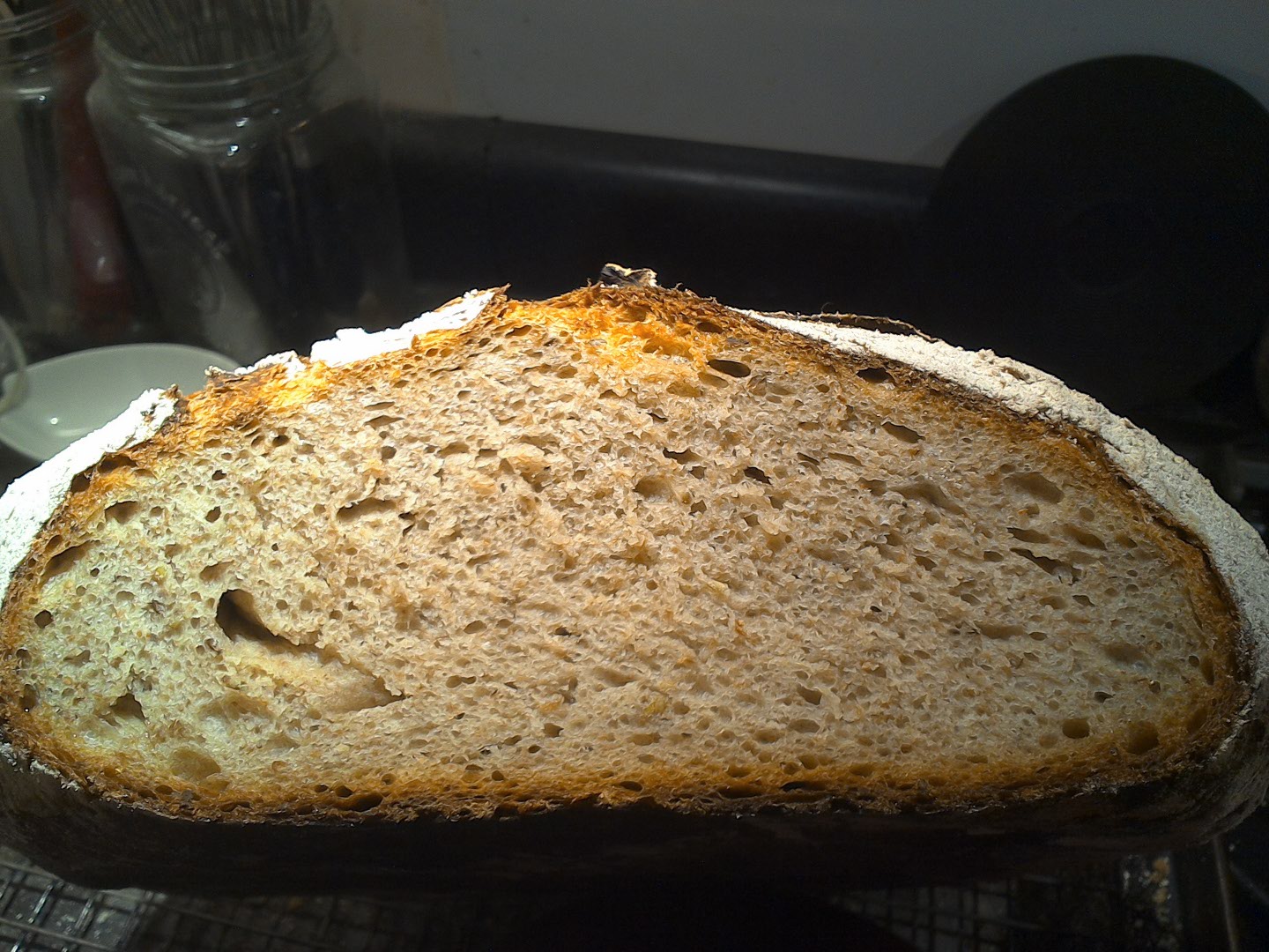 So, I threw in an unweighed glob of soaked flax seed in addition to the toasted sesame the recipe calls for. I had intended to mix the dough last evening, bulk ferment for a couple of hours and then cold proof the loaf (another ginormous boule) at bedtime, and bake in the caldera this morning. Except I completely forgot my patiently waiting levain until bedtime rolled around.