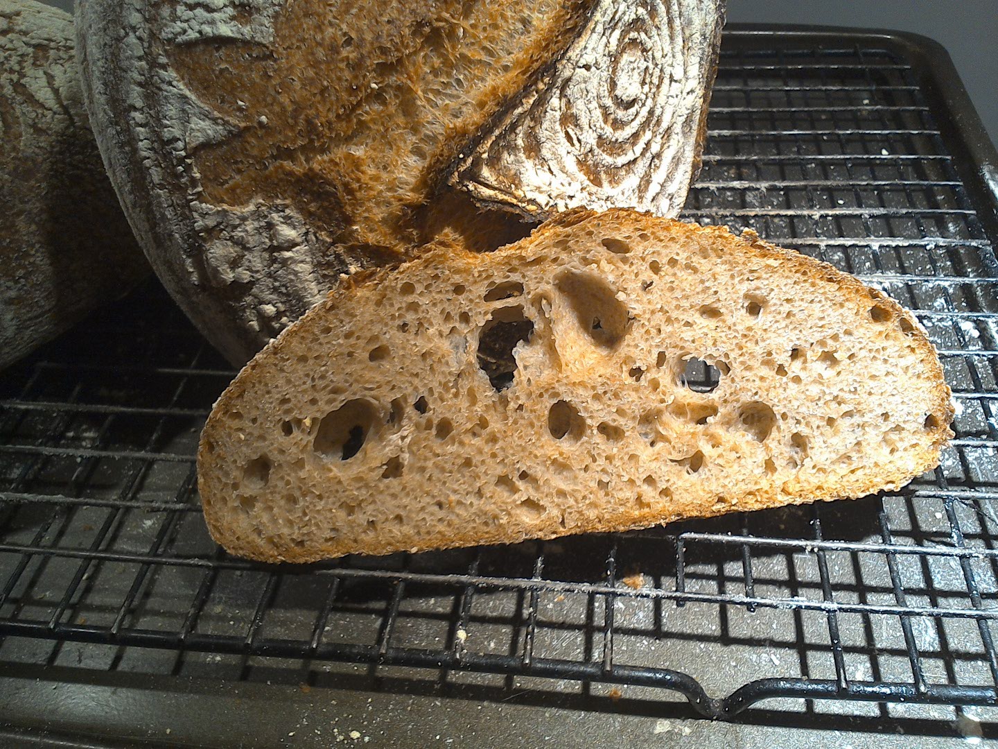 I decided to fool around a little with the 80%biga recipe from FWSY. Used 50g of my 100% sourdough starter to build the 800g biga, subbed in 25g each of WW and whole rye instead of using all white flour, and despite the whole grain flours ended up with dough so slack that my nerve broke and I added another 21g of AP during the mix. Oh, and in a further departure from protocol all the mixing was done in a Bosch universal. Gave it a lot of stretch and folds in the bowl during the bulk ferment.