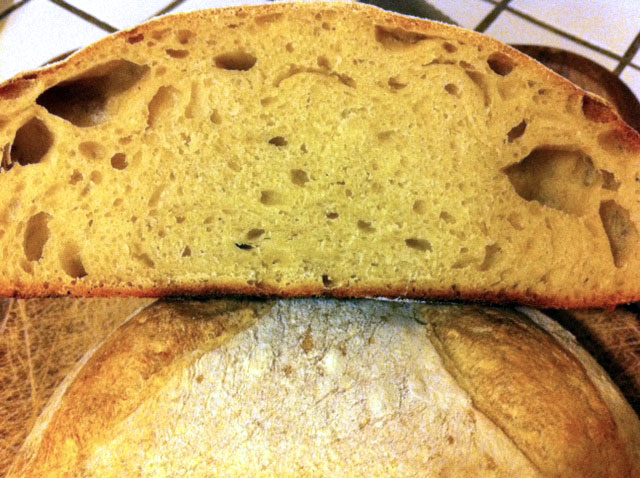 Wednesday: Removed dough from fridge at 2pm.  Allowed to come to room temp for 2 hours, then shaped.  2.5 hours additional rise, baked on a preheated stone at 425F.