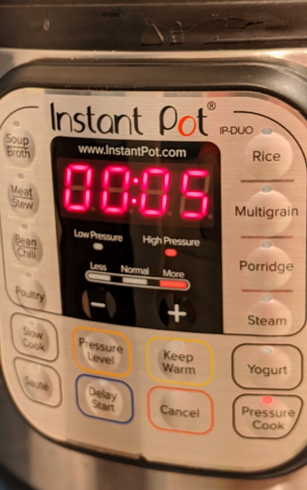 High-pressure cook for 5 minutes if you do not use the pith, and if you do, add a few minutes. Once depressurized, "saute" to boil the mixture until it reaches 220F.