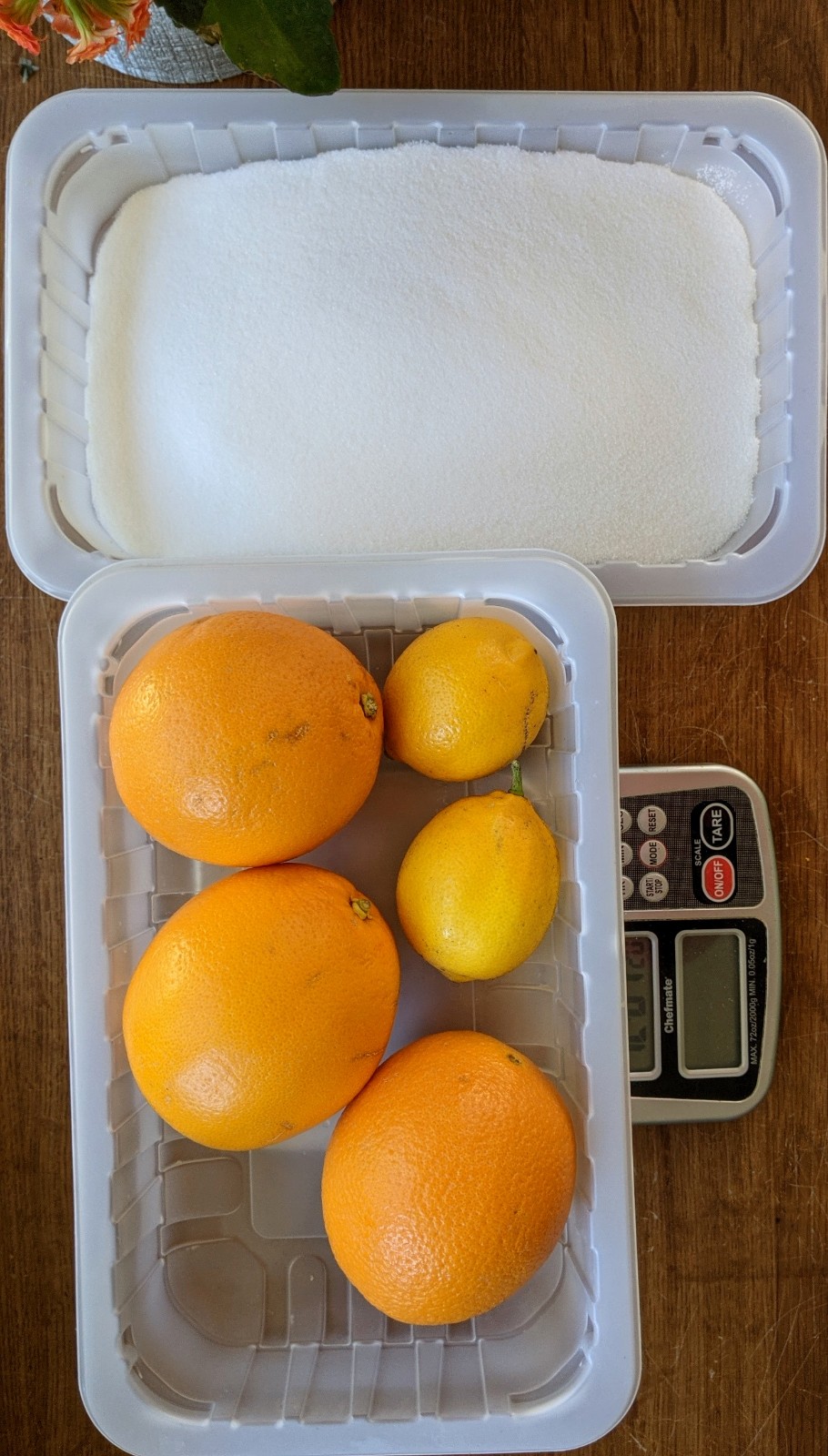 Weigh the citrus, then weigh an equal amount of sugar (1:1). You may adjust the sugar amount according to your preferred ratio. For every 2kg of sugar used, you need to add the juice of at least one lemon ?.