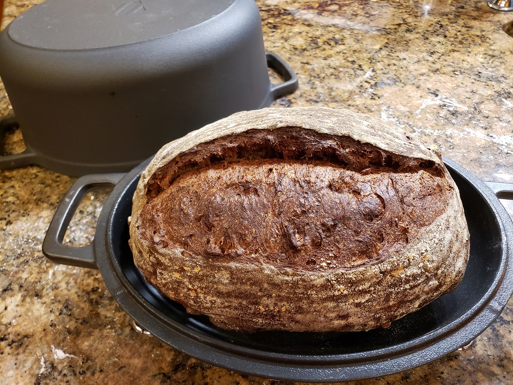 The bread is tasty, all good. Except the bottom 1/8" of the loaf - it isn't burned, but it is overdone and doesn't taste good. I trim it off and feed it to the dogs. They don't seem to mind.