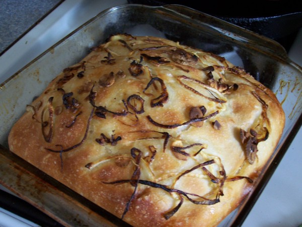 For the Foccacia I decided to make one according to Hamelman's instructions and the other one I baked according to the instructions I found in my italian cookbook by Marcella Hazan. The Hazan version calls for docking the dough after the rising time, with stiff fingers, and then drizzling the top of the Foccacia with an emulsion of olive oil, water and salt-this mixture will pool in the little hollows created by your fingers. One of them was topped with sauteed onions and the other with a little bit of onion and garlic.