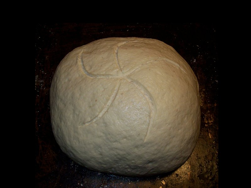 Here's the proofed loaf which I have just scored for baking. Recipe calls for baking at 375 degrees F for 35 minutes. I spayed the oven first, then again when I inserted the loaf, and again about 10 minutes later. I used a thermometer to bake to 200 degrees.
