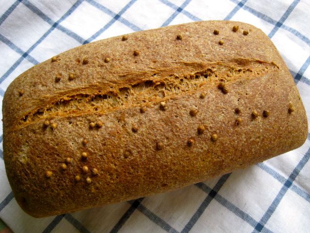 Shape sandwich loaf, place in lightly oiled loaf pan, mist with water and sprinkle with coriander seeds, pressing them gently a bit into dough. Score. Spray with oil spray, cover, and let rise for ca. 45 - 60 min., or until it has grown to 1 1/2 times its original size.