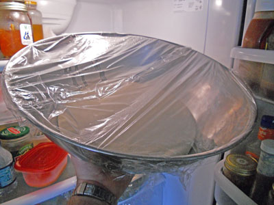 Let stand in covered bowl at room temp 1-2 hours or until it has increased by over a third in size, then cover with cellophane and place in fridge until Saturday morning. Day of pizza day, Saturday, take the dough out maybe two or three hours before your ready to make pizza. This last couple hours will bring the dough to room temp and rise a bit more. Don't look for double bulk, that sort of thing. This dough recipe is about six to seven cups of flour, of which can make several pies easily.