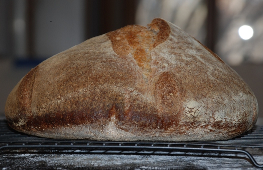 When I read your post, I bookmarked it planning to bake it soon.   I guess soon is 2 months.   Here is my humble attempt at it.   I pretty much followed your instructions, except messed with the schedule a bit - I cut the bulk ferment short (anxiety over semi-whole grain doughs liquifying) and instead of cold retarding, I proofed for 3+ hours.    And didn't go to sleep as instructed.    Can't match your scoring, but I did get the mountain profile.   Can't wait to cut and eat.   What a great formula.   Post more please.  -Varda