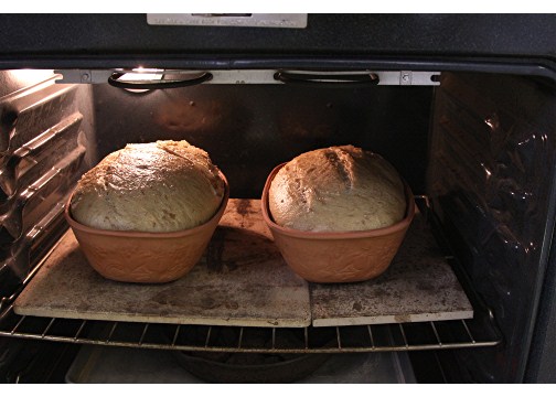For this baking - After bulk fermentation, I divided the dough in half and final proofed it in the two terracotta baking ovens. Even though I dusted the inside bottom of the terracotta baking vessel with semolina and left them in the baking dishes after they came out of the oven, to steam for about 10 minutes after baking, the sides of the loaves slightly stuck to the sides of the baking dish in spots and I had to used a large pastry spatula, like they use for applying icing to cakes, to slide between the loaves and the dish to free up the sides. Next time I'll spray the insides of the dishes with PAM and cut a piece of parchement for the inside bottom of each of the baking dishes.