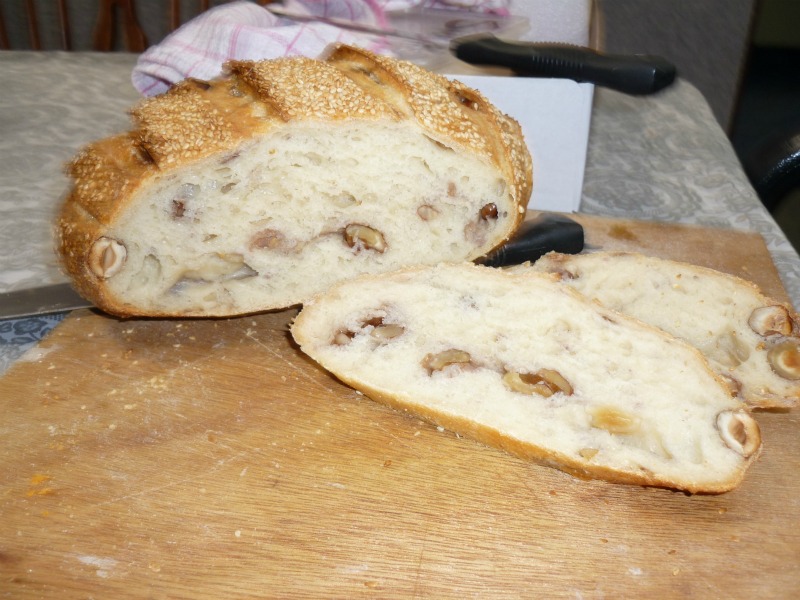 Last week 's bake was a single loaf sourdough with hazel and walnuts