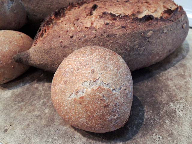 The bâtard crust was somewhat crunchy. The crumb was more open and more tender than that of the rolls.