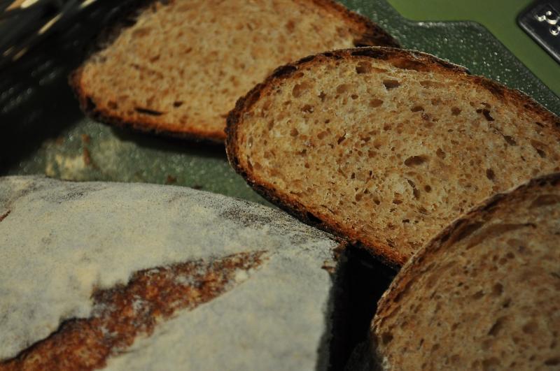 I cut up my rye loaf today and froze it in slices. It is much lighter in crumb color than the rougher Chilean rye flour. I can almost see purple around the walnuts!