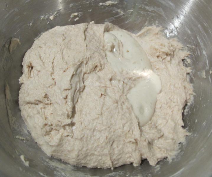 Levain (night before): Mix the levain and allow it to ferment overnight at about 68F. My goal is to have the levain well-risen but not yet ready for another feed- a young levain. In hotter weather my seed: flour ratio is 1:10 and in cooler weather it is 1:2.
