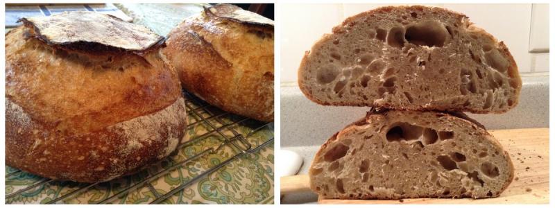 Also, the flavor was much milder than I had hoped for, despite the 12 hour retard. I wonder if I didn't let the leaven sit long enough. I mixed the leaven at 6:30 am and it sat in a coldish room (62-65F) until 3 pm. It passed the float test, but maybe with another hour or two the flavor would've developed further. I don't like a strong sour, but these loaves were a bit bland. I know a darker crust would've helped a lot.