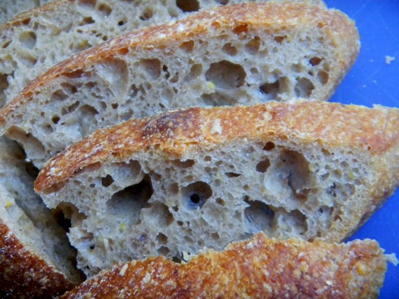 The crumb was; very open with irregular holes, soft, moist and very glossy. But the best part is the medium, tangy taste that is deep in complex flavors, a little nutty and seedy with toads in the background shining through. This is the best tasting white SD bread we have made for a long time.