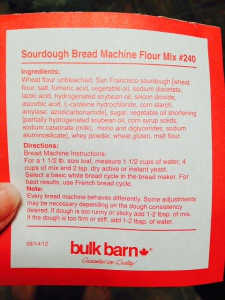 So today we went grocery shopping, and dropped by the nearest company that sells basically everything you could ever dream of for baking (especially sweets, cakes, etc. but also breads) by bulk. It's called "bulk barn". I went straight to the flour isle and saw two top contenders for purchase to either add to or begin a brand new starter. The first, and obvious choice was the dark rye flour. The second option, which I also picked up some of, was called "San Francisco style sourdough bread machine flour" (the San Francisco part was on the main container at the store). To help with all the potential questions that might be asked by the reader to really identify what this is, I took a picture that will help: