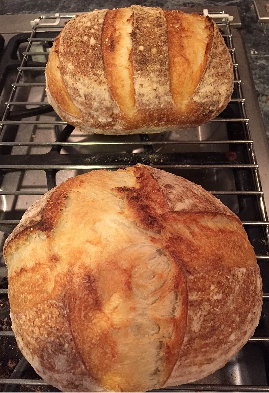 I've never tried that, but sounds like something to try. So if you use a cover, do you not use water? Also, do you adjust bake time and temperature? I did a "no knead" in my cast iron dutch oven once (high hydration), will that work too? While the boules are good looking, I'm thinking about switching to a batard so they are easier to cut. I get nervous when my teens go to cut :) Maybe loaf pans would be best too!