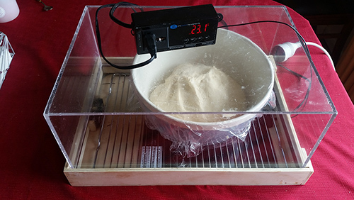 Some time ago I had a perspex box made specifically to cover loaves of bread while rising. The box was not cheap. This proofer uses the perspex box but really any plastic box can be used.