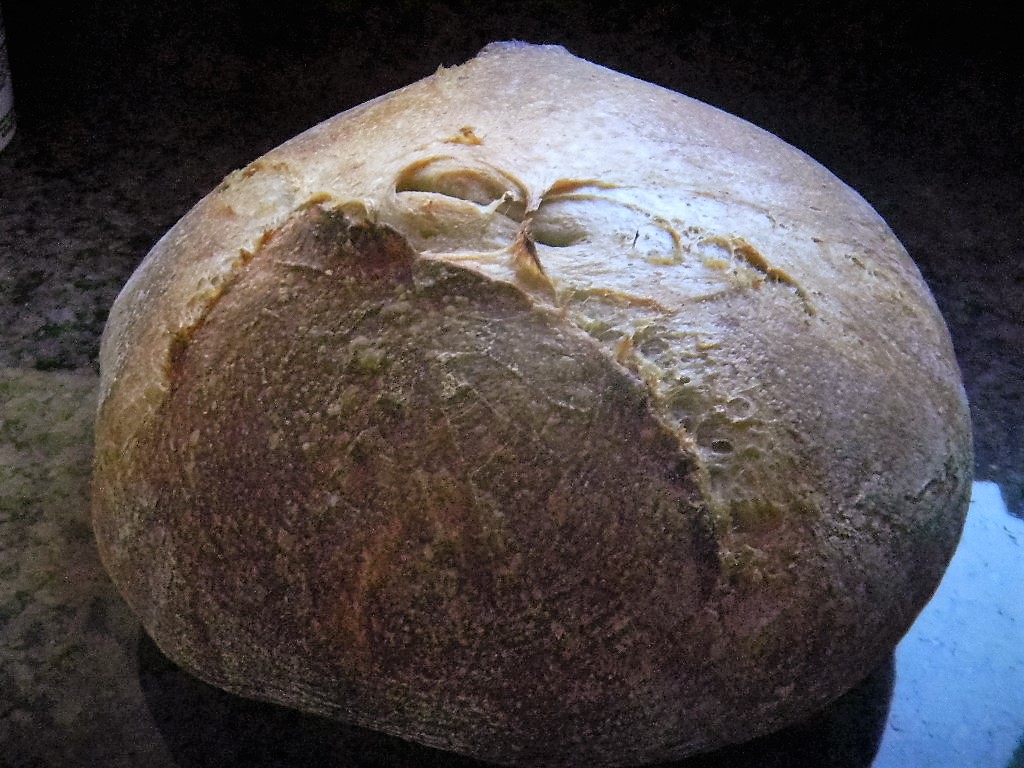 10 minutes later the bread had browned up nicely and tested 2o8 F on the inside when we removed it to the cooling rack. For some reason it didn’t splat as much as we thought it would and it did not blister at all since it wasn’t retarded and cold when it hit the heat- but it smelled great as it cooled. The bottom was more brown than the usual retarded loaf as well.