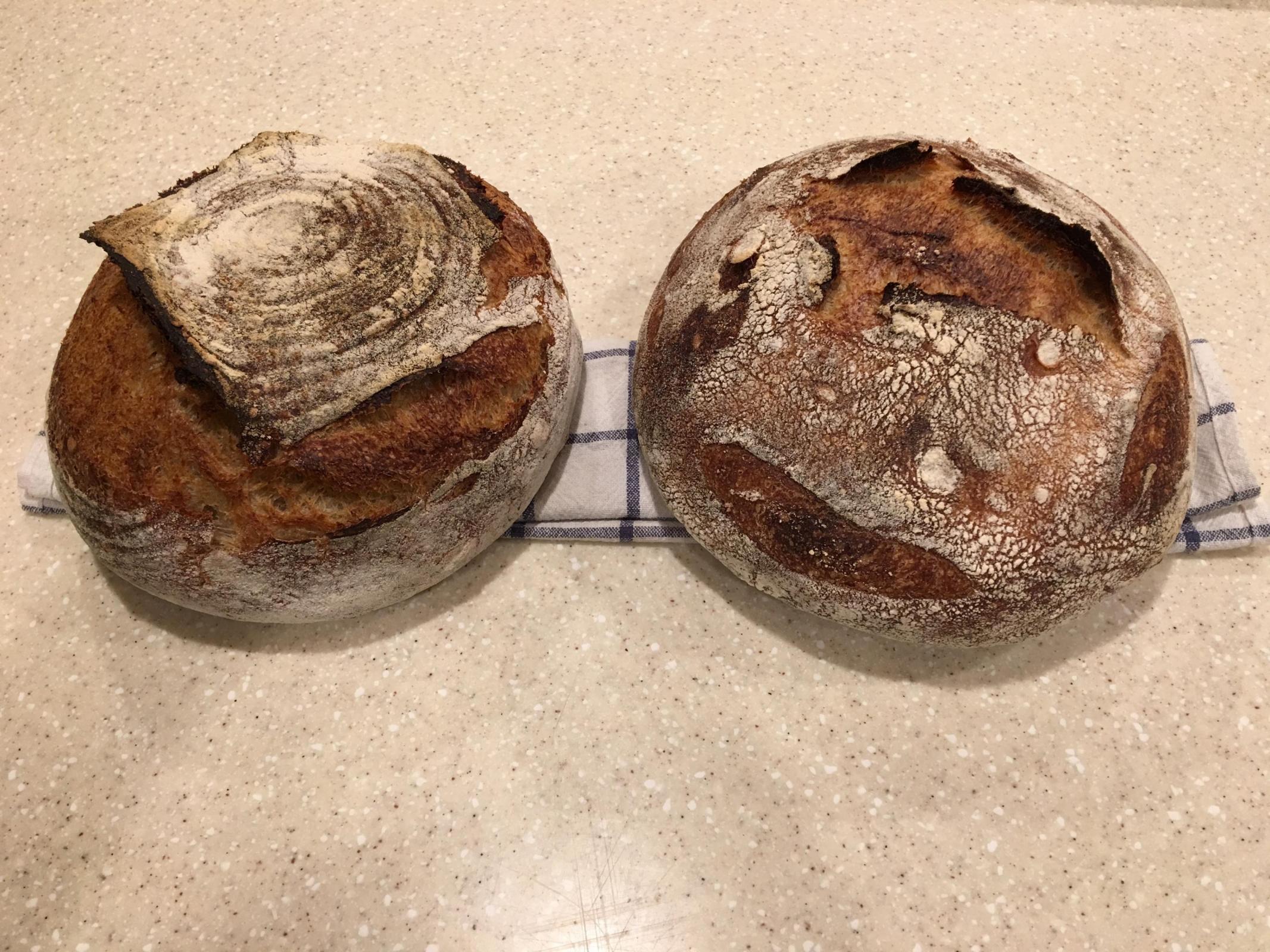 I will try the patting down before final shaping next time. I baked both in dutch oven but I scored them differently. I baked the one on left first. Then I thought the second one will be proofing too long so I kept the on on the right in the fridge fro the 45 min that the first one was baking.