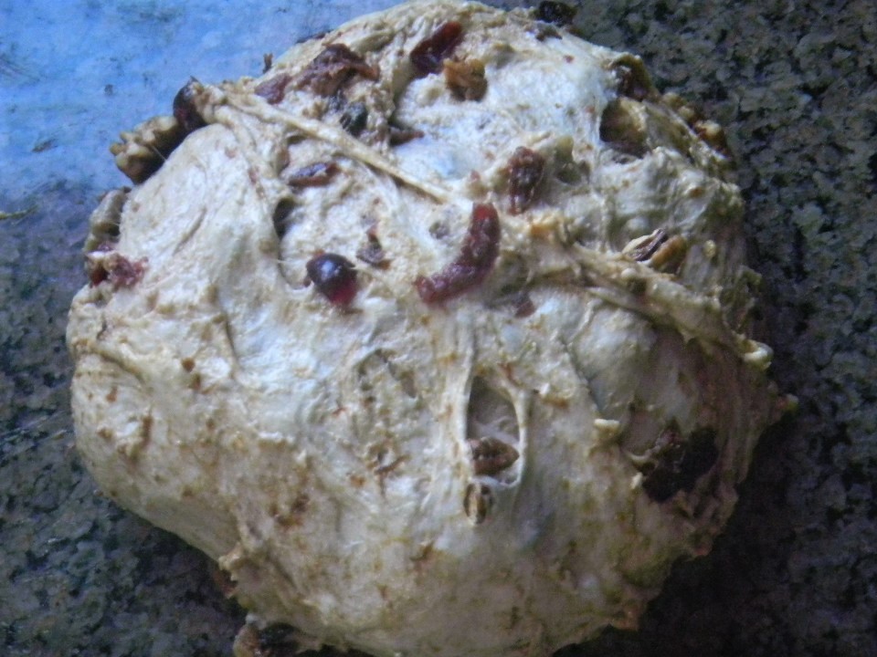 This one had a 10% preferment flour, whole wheat (white and red), 100 % hydration levain.  Overall whole wheat was 25%.  We did 1 set of 50 slap and folds and then 4 sets of stretch and folds – all on 30 minute intervals.  The prune and cranberries were rehydrated with the liquid squeezed out and reserved to make yeast water.  The fruits with the pecans went in during the first set of stretch and folds.