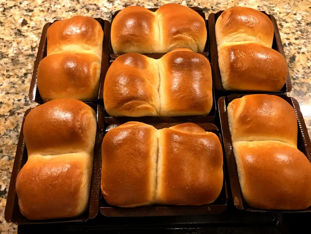 Basically, all I did was make the Tangzhong the night before and then mixed it all up in my KitchenAid and went to town on first proof, folding, second proof, dividing, preshaping, more proofing, rolling, shaping, panning, more proofing, preheating, egg washing, baking, rotating, baking, rotating, baking, cooling, decide I'm too impatient to wait, eat one while it's hot, go to be at 2am, get up at 5:30 am and play with the two sourdough I left to proof before bed. Ok time to get them in the oven, I hope they come out fine.