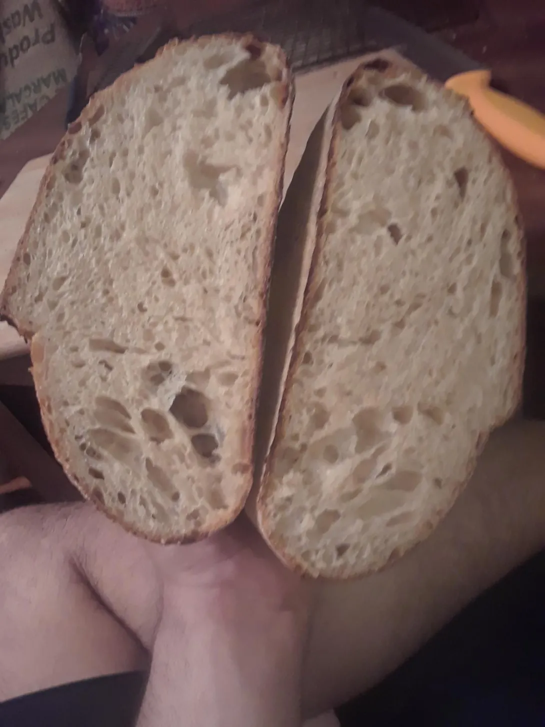 I read the first half of "Open Crumb Mastery" and realized that I wasn't maintaining my starter properly. After a few feedings, I made this loaf. Same method as before, which is the method seen in the video for 'Champlain Sourdough' by Trevor J on YouTube. This loaf is light and airy instead of slightly gummy like my last 2. But it doesn't have that open crumb I'm looking for.