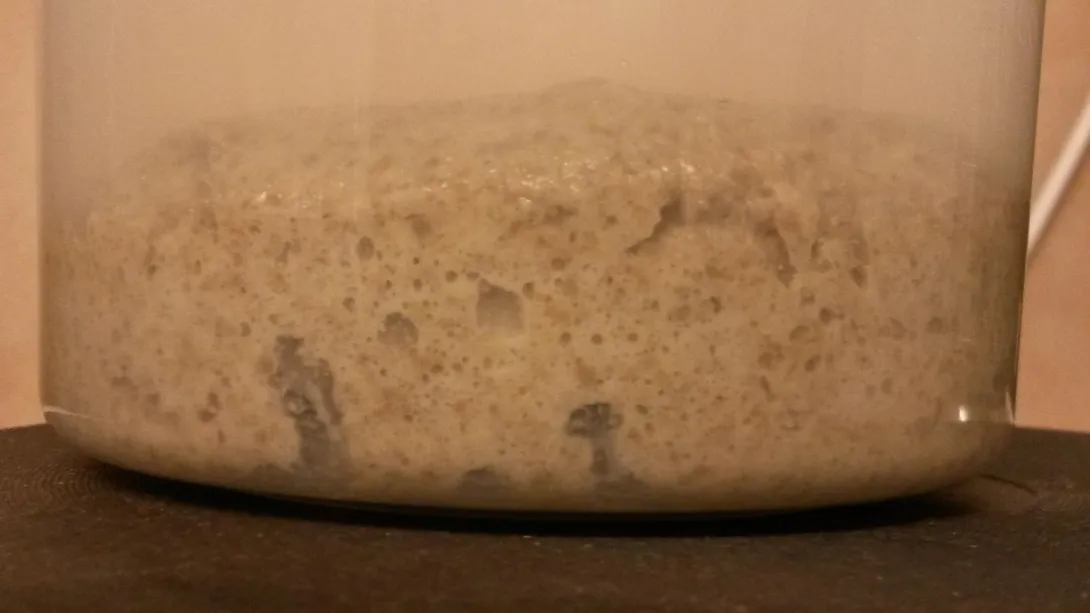 Appearance: got home to find it has risen twice as much as yesterday, inside all spongy, big air bubbles and the dome still holding almost 24 hours after its last feed.