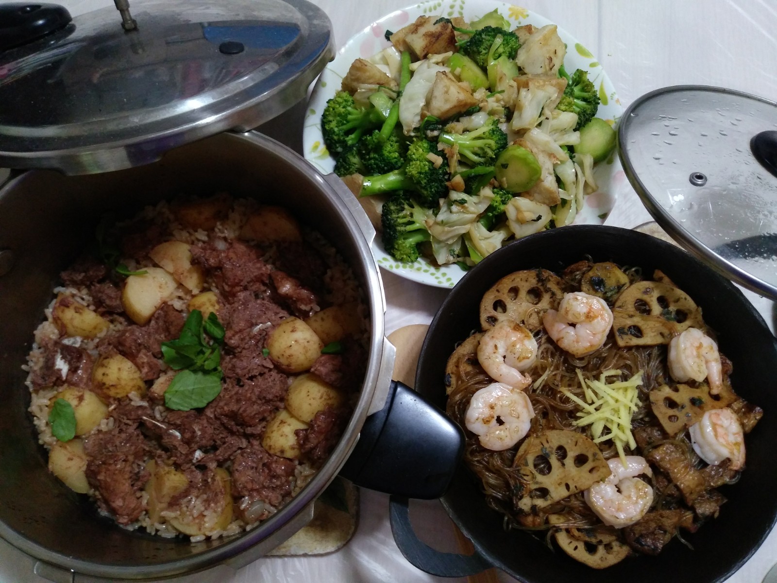 Fermented red beancurd marinated ribs & potatoes rice, Thai basil vermicelli with shrimps & lotus roots, and garlicky mixed veggies