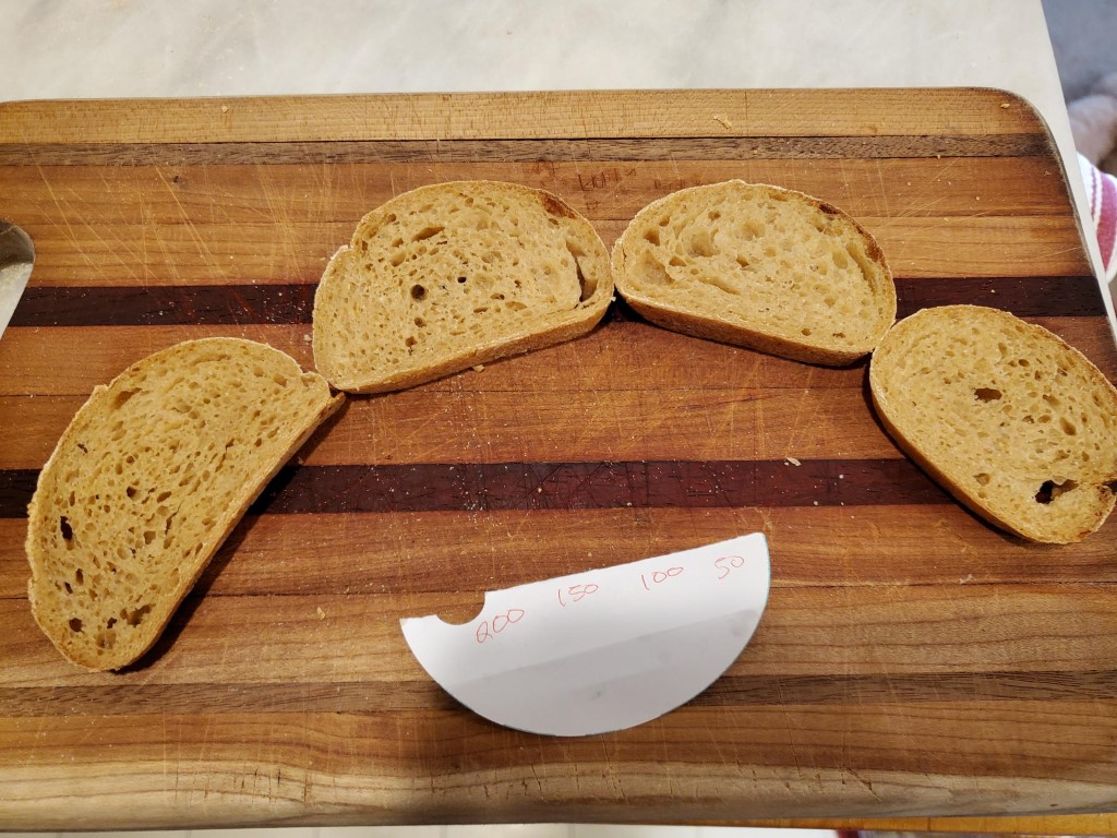 Since the last time I did not see much difference,  I decided to go big -  I made one batch, then divided into 4 equal doughs, then bulk fermented in measured containers  to the following increases in size 50%, 100%,  150% and 200%.  I felt sure  I would see some wide variations.   As each one hit the mark, I made into a baguette shape, then onto a couche and into the fridge.  I finished kneading and dividing around 9:20,  the first sample was ready at 1:30, then 2:10, then 4:30, then 5:10.   The all BF in a 82% proofer, I think the issue with the 3rd batch was in dividing to make sure each dough weighed the same,  I must have handled them differently, because by the time the second one was ready,  I could tell the dough in the container marked 200% had already risen more than the one in the 150% container.     They rested in the fridge over night, and the next day they went in the oven together - too many for me to cover, and it went into an oven I normally do not use for baking, so the color was not very good.  The surprise to me -  they all looked fine .  I would have guessed that the 200% would have been thoroughly spent and would not rise at all, but it did.  Here it a photo of the slices with a piece of paper showing which was which.  BTW, my wife blind tasted them, and felt the 200% tasted the best.