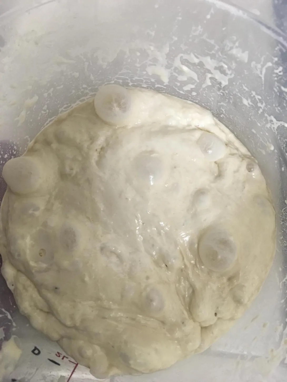 I've never made a loaf this bad. I like holes but wow. I’m guessing over although it had just doubled. Last time it close to tripled and looked more normal than this. The indent stayed with the finger dent test.