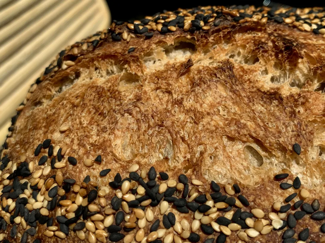I did my usual process, mixing the flours, water and starter together, then resting for 30 minutes. I did two sets of ~20 stretch/folds, separated by 30 minutes, then about 90 minutes of bulk proof (this is all at ~75F.) Both doughs were looking good at this point, so I pre-shaped, bench rested for about 30 minutes, then did a final shaping and popped them into my bannetons, lined with towels, and with a mix of sesame seeds. The loaves were then proofed @ 75F for about an hour, then popped into the fridge while I heated the oven. 45 minutes later, I baked loaf #1 (batard w/freshly milled flour), 13 minutes covered and 20 minutes uncovered. Then I baked the second loaf (this one did not seem to have the same oven spring, so may have suffered from the extra time proofing in the fridge……)