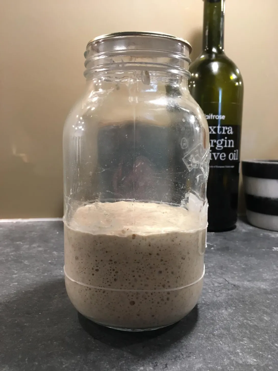 A week ago, or so, I decided to toss it in the fridge. It was a very active starter that required 3 feedings a day so, I decided to slow it down.