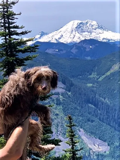 Lucy is sending a picture of her Niece in Seattle after she hiked up to a mountain lake to go swimming with <t Rainier in the background.  What a beautiful place to take a very cold swim.  That Mabel is a hiking trouper for sure.