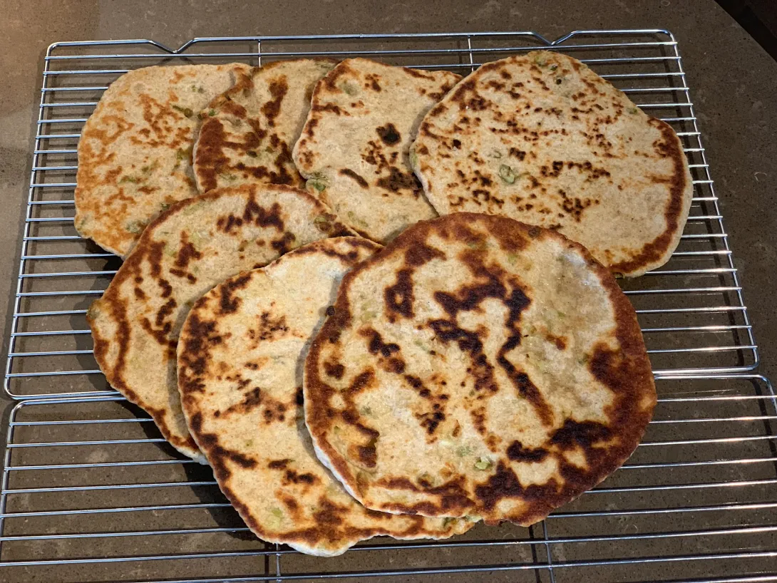 In my ongoing quest to ensure that no sourdough starter goes to waste, I found a naan recipe on Breadtopia.  I’ve flavoured it with the addition of scallions.  I have to say, having just eaten one hot off the cast iron skillet that they taste great.  You can really taste the sourdough and yoghurt along with the scallions.