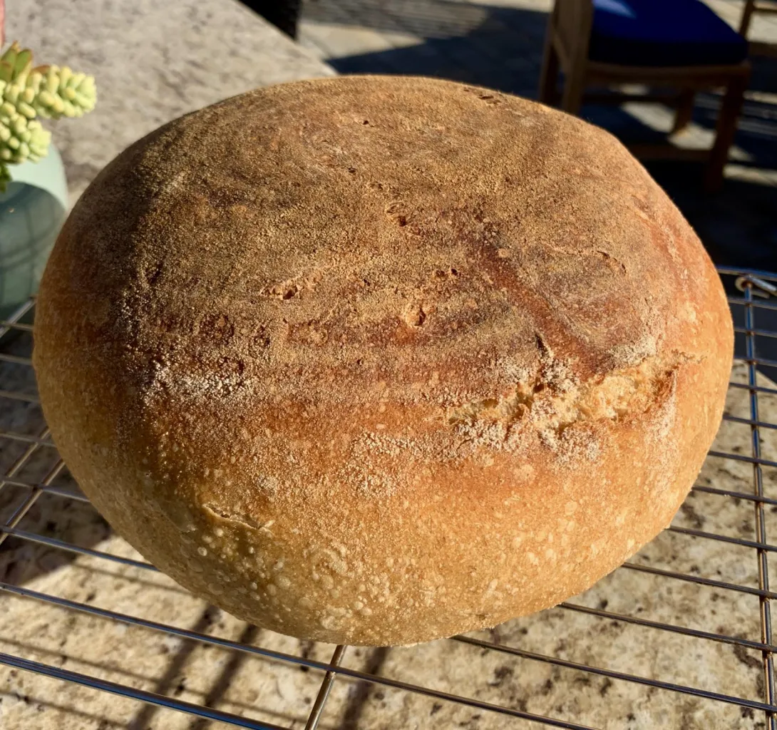 Once my IR thermometer was reading 500F on the lid (lower on the exterior sides of the DO), I loaded my loaf. I didn't slash this one, as I proofed it seam side down for natural bloom. I rotated the DO and lid in opposite directions every 10 minutes to even out the heat. After 20 minutes I took a peak and was a bit disappointed to see no bloom at all, but was very pleased with the color. After another 30 minutes, it became apparent that I needed more heat on the bottom next time, so I flipped the loaf to even out the color. After 40 minutes, the loaf was done (210F internal), so I removed it to cool: