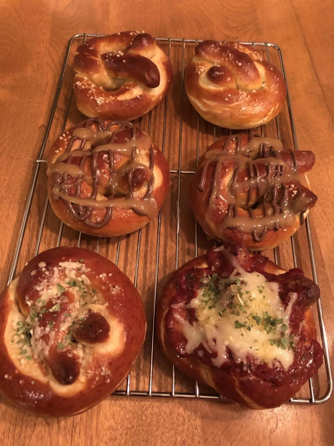 Pretzel dough is fun to handle, not sticky so it's great for kids. It was fun to think of different flavors and toppings. Like salted nutella caramel, pizza, jalepeno cheese, garlic parmesan or just plain salted dipped in yellow mustard.