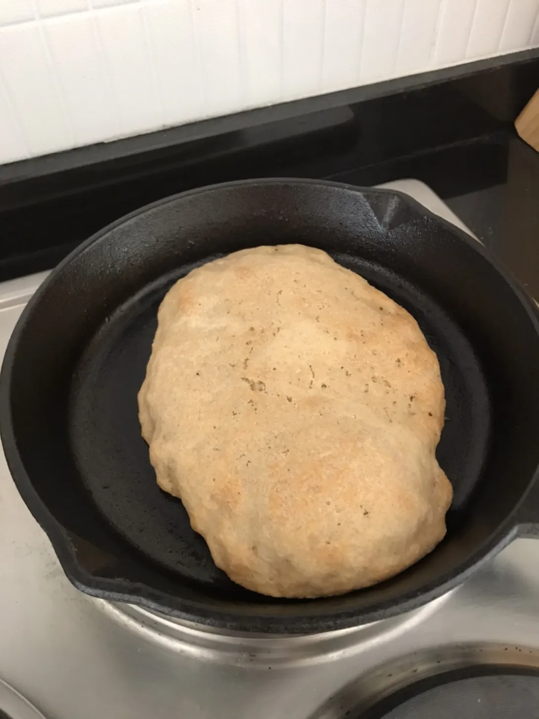 Since it was so slack, I thought it looked like a ciabatta dough, so I whipped out cast iron skillet and bake (or probably you could say fry?) it as ciabatta would (pun...kinda intended, sorry =p)
