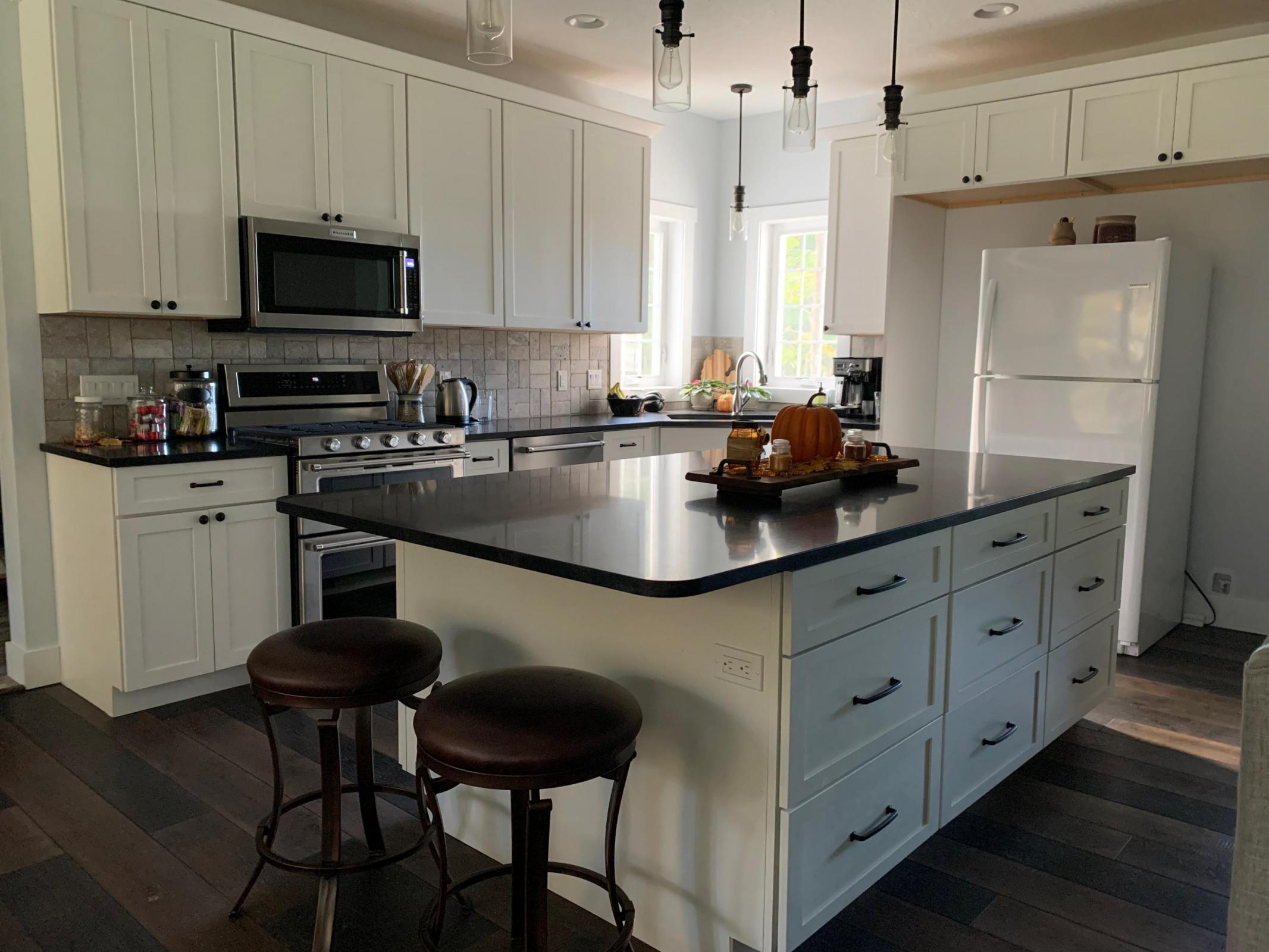 Our kitchen. Notice how the refrigerator looks lonely in its space. That's because it is a loaner until the manufacturer ships the freezer and the refrigerator that we ordered. The most recent delivery estimate is "sometime in fourth quarter".: