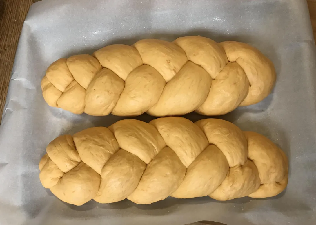 Give your braided dough a final rise, on the counter @ room temp, covered with plastic wrap, for 45 minutes.