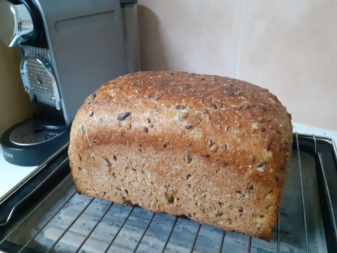 Fresh out the oven and cooling. Good idea to take a baked bread out of the oven just before bed. This way as it's cooling I'm not tempted to take a slice. Goes with lots of things and really shines when toasted due to the seeds. Either with a nice nut butter, and/or jam, or some mature cheddar.