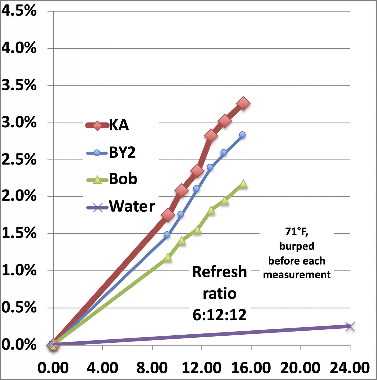 So, the initial estimate of how much CO2 might be lost was high enough to make it interesting to pursue measuring actual weight loss in a high hydration levain. My expectation was that the amylase enzymes would continue to produce sugars from the starch and the process would run until something (perhaps metabolic byproducts or pH sensitivity might poison the environment) slowed it down.